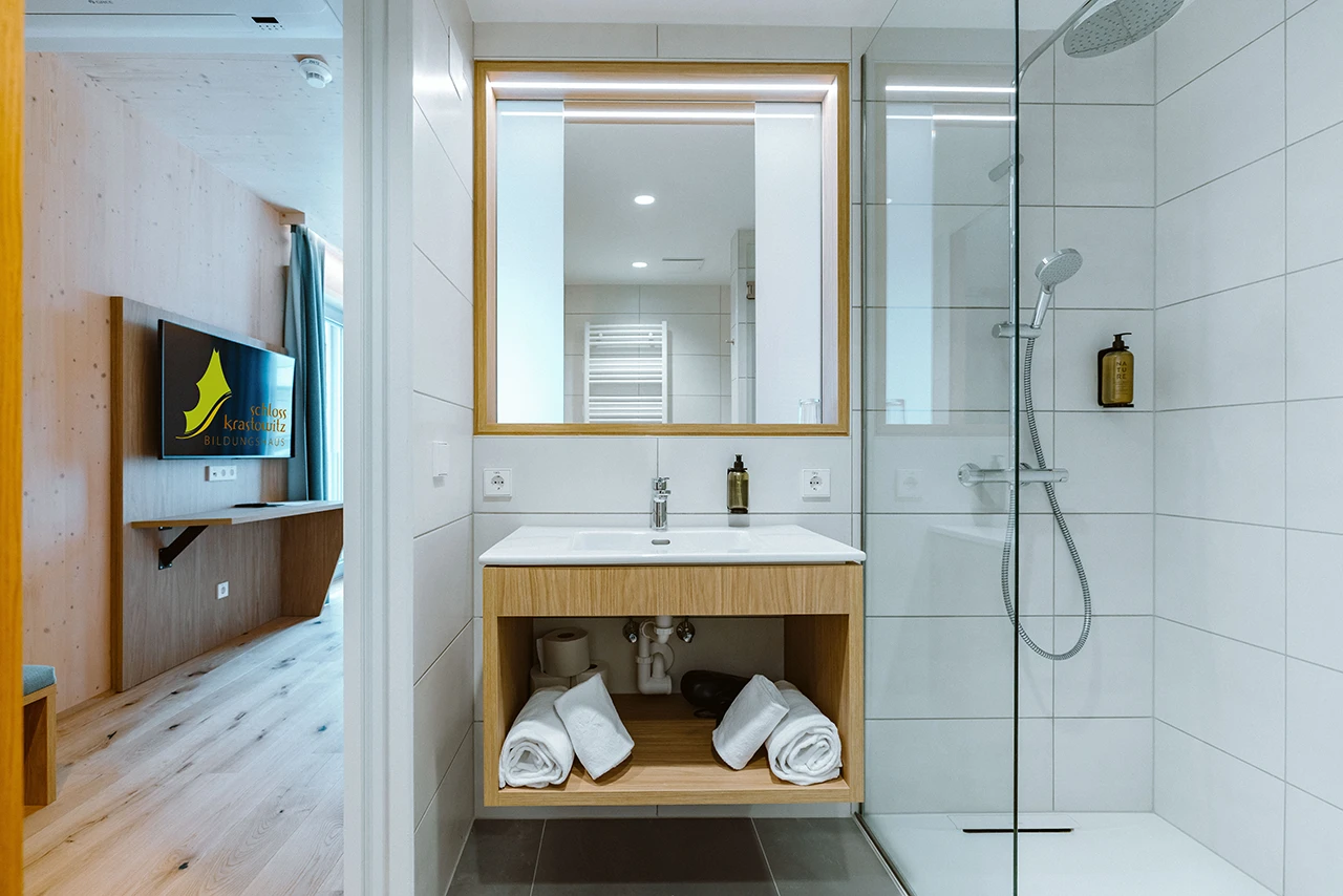Die Zimmer im Bildungshaus Schloss Krastowitz sind als helle, freundlich gestaltete Doppelzimmer ausgeführt und verbinden Komfort mit natürlichen Materialien wie Holz. Klimatisierung und barrierefreie Ausstattung sorgen dafür, dass sich alle Gäste wohlfühlen können. Die ruhige Lage und die kurzen Wege zu den Seminarräumen ermöglichen erholsamen Schlaf und einen entspannten Start in den nächsten Veranstaltungstag.